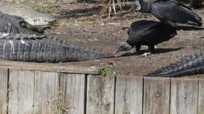 Before I tell more, let me continue on with the rest of the visit. When we got to my favorite part where the birds ride on the alligators (See Gatorland’s Taxi Service), I was again videoing the activities. I noticed on the little island that some more Black Vultures were again at the tail of another large alligator.